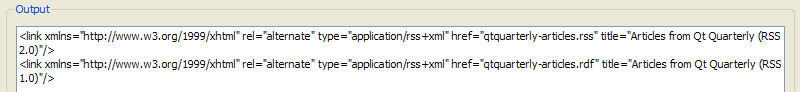 We invoke the resolve-uri() function to resolve the relative URI against the base URI, forming the absolute URI. The result of the query for RSS links looks like this: