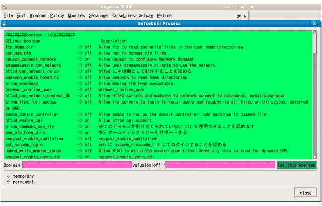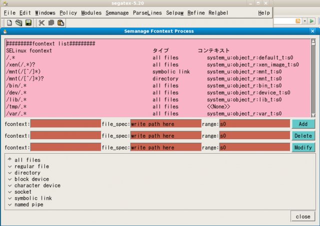segatex с это приложение, с которым даже не зная ничего о командах SELinux, можно просто задавать и выполнять их с помощью GUI. Написано на C++. Требуется Qt ( qt-devel package).